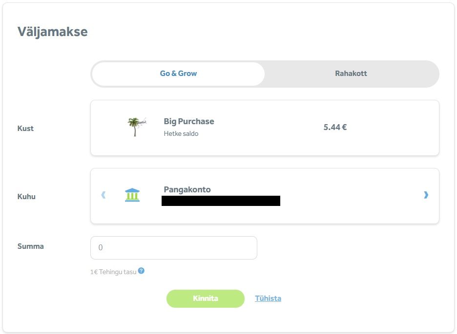 Tähelepanu! Kui kannad Go & Grow' kontolt raha oma Rahakotti või pangakontole, tuleb olenemata väljamakstavast summast tasuda ühe euro suurune väljamakse tasu.