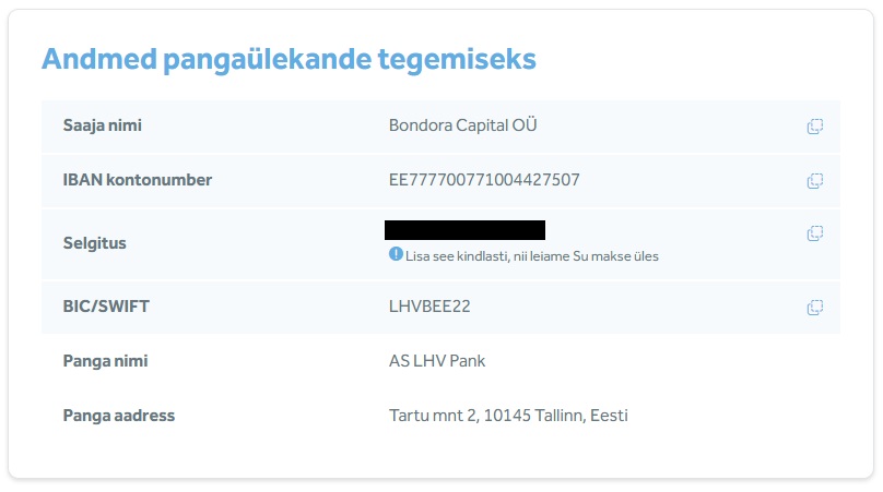 Oma Bondora kontole saad teha välkkiireid makseid pangaülekandega (SEPA-makse). Need on kiired, turvalised ja võimalikud igal ajal. Maksed toimuvad reeglina hetkega, kuid olenevalt pangast võib makse laekumine võtta vahel kuni 3 tööpäeva.