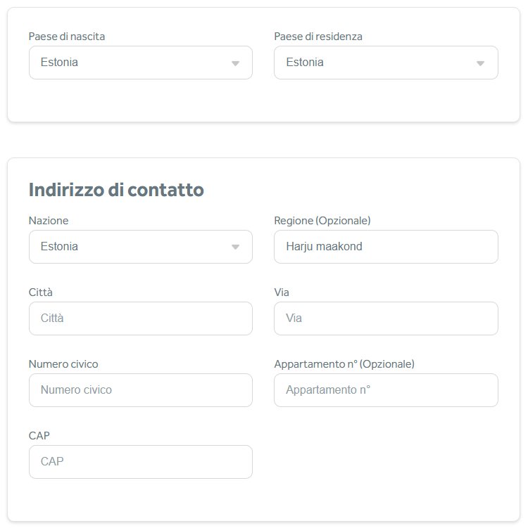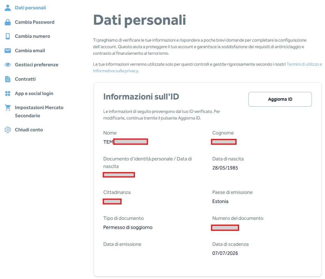 Ti preghiamo di notare che i dettagli del documento di identità nella sezione ID vengono compilati automaticamente e ricavati dall'ultimo documento di identità che hai verificato.