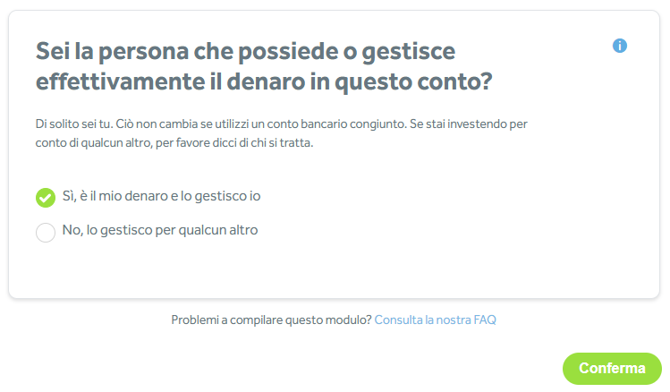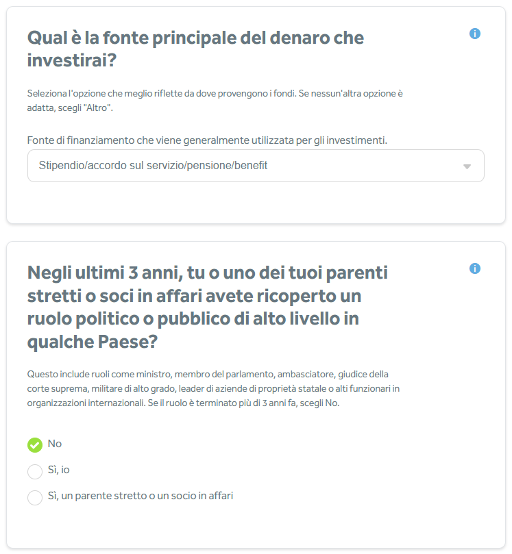 Prima di poter finalizzare il tuo account e concederti l'accesso agli investimenti, devi compilare il breve modulo KYC (Know Your Customer). Questo si aggiunge alla verifica dell'identità e del conto bancario.