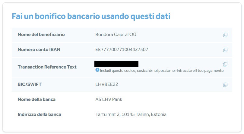 Per i clienti dell'Eurozona i costi sono generalmente gli stessi dei versamenti nazionali, ma ti preghiamo di verificarli prima con la tua banca. Se la tua banca addebita i costi anche al destinatario del versamento, questi saranno addebitati sul tuo conto Bondora.